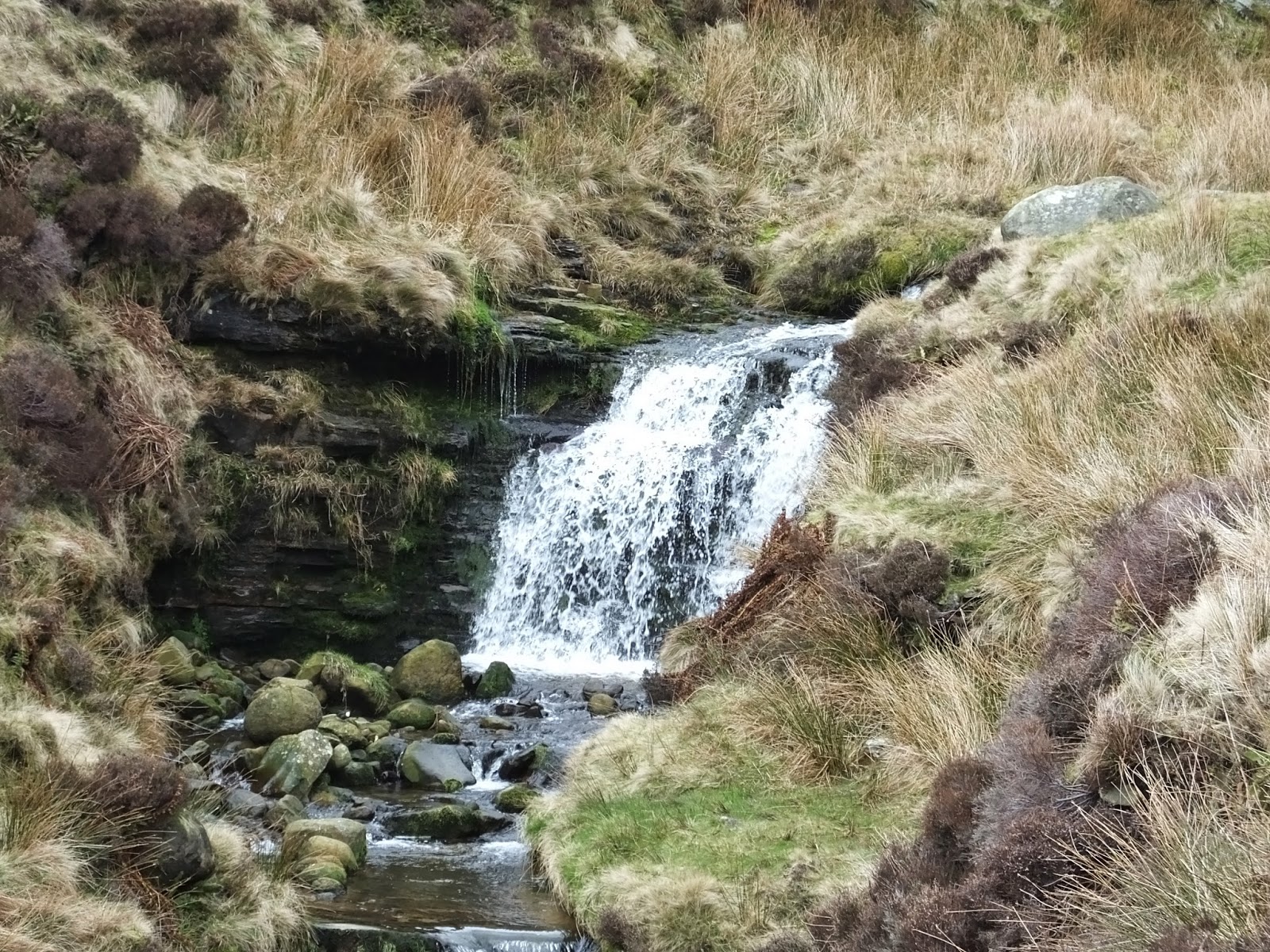 We soon reached Crowden Clough. The path here winds rather lazily through the valley alongside, and sometimes through, the thankfully fairly shallow stream that is Crowden Brook. What the stream lacks in depth, it more than makes up for in natural beauty, particularly in the form of waterfalls. Here are a few pitiful attempts at photographing them: